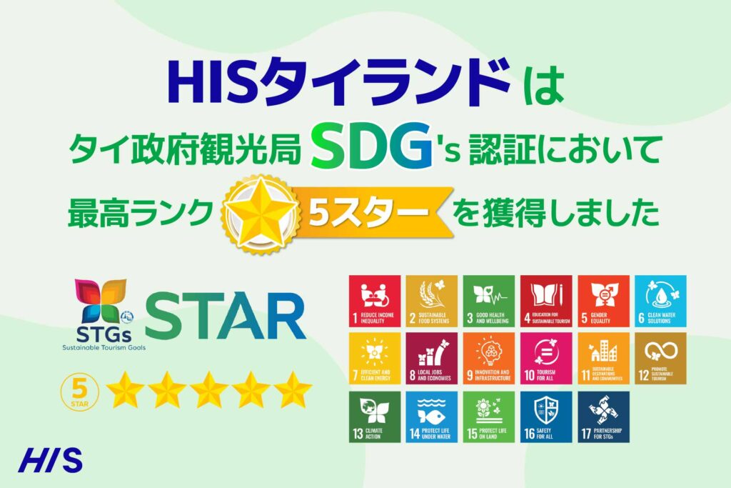 HISタイランドは、2025年9月15日にタイ政府観光局(TAT)のSDGs認証制度「STAR」において、最高ランク「5STAR」を獲得しました。 これは、日系旅行会社では初(*2025年9月時点)となります。