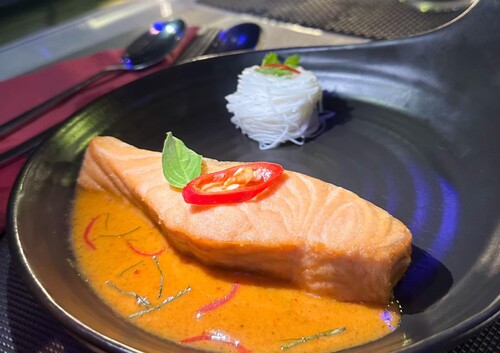 ・メイン料理:シーフードのスパイシー炒めスパゲッティ(パッキーマオ風)、サーモンステーキ チューチーソース添え(ビーフン付き)
