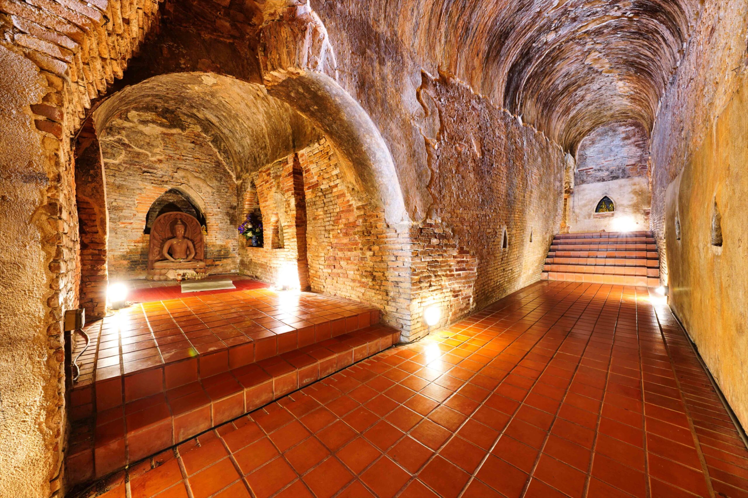 歴史ある寺院で、「ウモーン」(タイ語でトンネルの意味)の寺と呼ばれています。地下に広がるトンネルの中には仏像が安置され、静かな空気に包まれています。